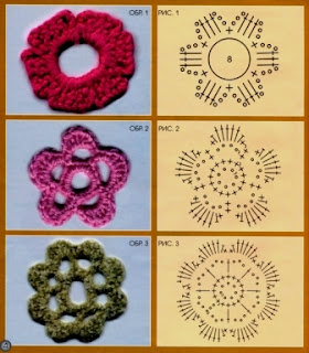 По просьбе своих учениц, семиклассниц, публикую схемы вязания крючком элементов в виде цветка для изготовления броши - аксессуара для швейного проектного изделия. Схемы "подсмотрены" в журналах "Сабрина. Вязание крючком". Интересные идеи по созданию очень простых вязаных изделий можно посмотреть здесь